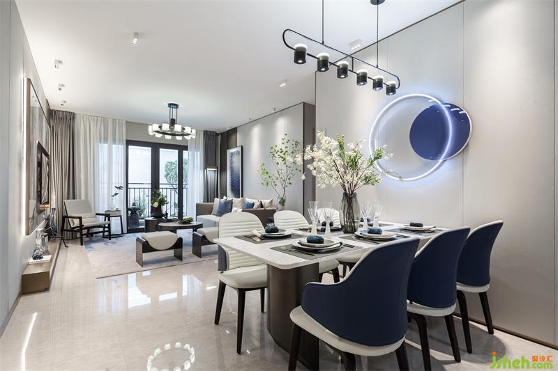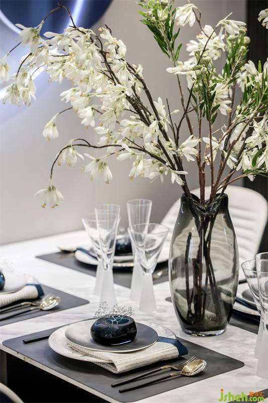 東方文化的骨髓里都在強調(diào)對稱和儀式感,整齊劃一的餐具,對稱排列的餐椅,星星陣列的吊燈,在碧城色圓月型壁燈的照耀下,有種圓滿又回歸的悸動。女主人精心準備的姜花顯得格外的典雅和悠揚,畫面再現(xiàn)“漫空沙氣蜀姜黃,一角高城漏日光”的場景。
