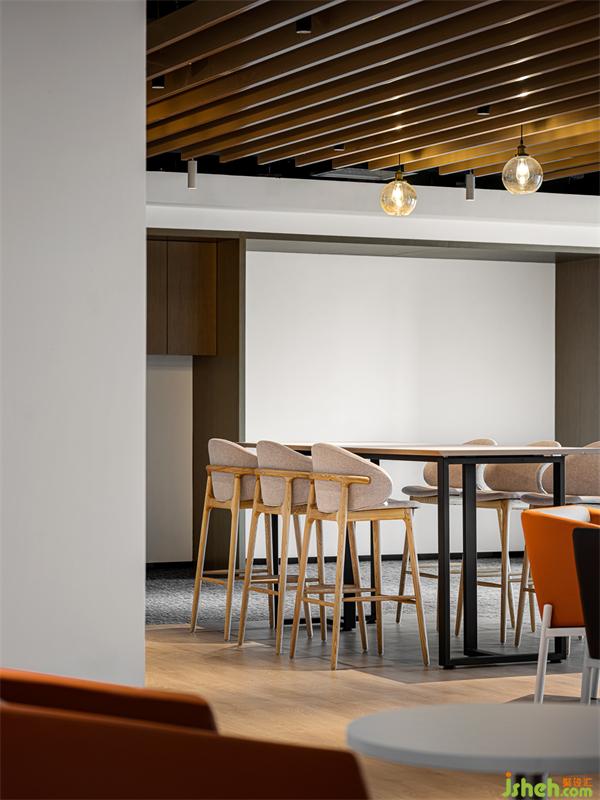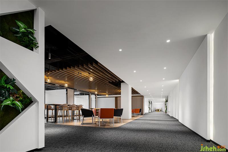 辦公空間通過“中央休閑區(qū)”和通道綠植墻,構(gòu)建出一個休閑和綠色區(qū)域,家具選品采用簡約造型且高低層次豐富,功能上具有多種組合的產(chǎn)品,色彩上也采用了撞色組合,使空間的氛圍更活躍,更自由。