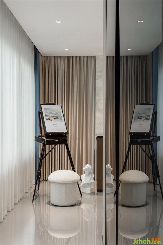 樣板房設(shè)計以空中展館為靈感,塑造小主人獨享空間。打造靜謐且私密的居住場所,同時也是他們放下一切,專注于自己喜歡的事情,獨具一別的私人展覽空間,旨在營造一個私我的精神會所。
