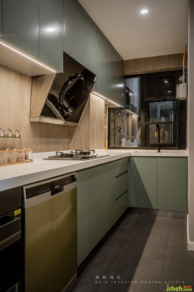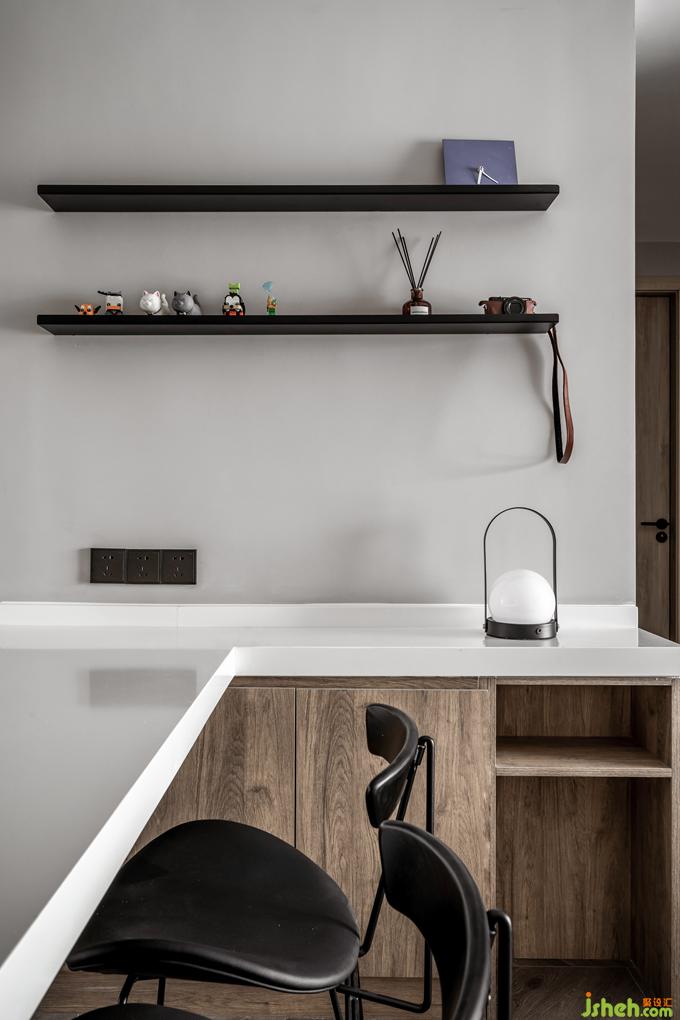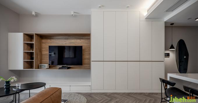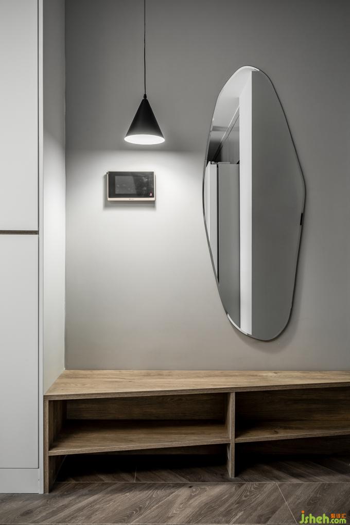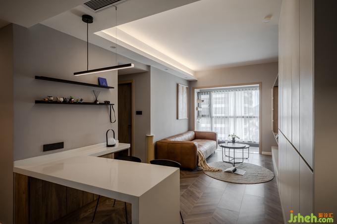 客廳的布置簡單干凈,暖灰色墻體搭配原木色電視柜,室內(nèi)設(shè)計師一組沙發(fā)+橢圓茶幾,日常坐在地毯上,靠著沙發(fā)看劇,擼貓,或在茶幾上進(jìn)食,一個人的生活,便能如此隨性自由。電視柜的設(shè)計增加了客廳的儲物功能,拉平了客餐廳墻體,從客廳看室內(nèi)過道,將公共空間連成一體,相互呼應(yīng),擴(kuò)大空間視覺感。