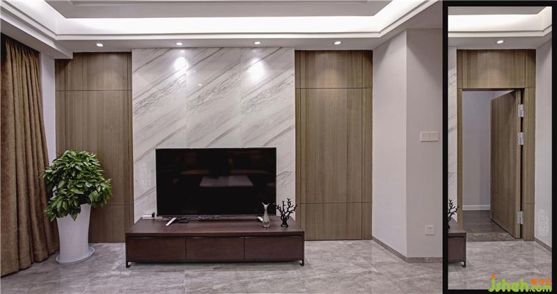 前提滿足生活陽臺的功能性同時(shí),而選擇擴(kuò)大客廳空間,重點(diǎn)營造整個(gè)公共空間視覺感??蛷d電視背景隱形門設(shè)計(jì)起到虛實(shí)的不斷變化,也滿足業(yè)主心理需求——見和不見??蛷d以爵士白大理石和原木飾面建立一個(gè)質(zhì)樸安寧的素雅居住氛圍,達(dá)到一種更接近與內(nèi)心自我、更接近天然的狀態(tài)。自然采光略少的餐廳,采用了更為利落、輕盈的手法,與客廳形成明顯的空間跳躍感。體量不小的邊柜,將一切餐用有序地歸納、整潔。