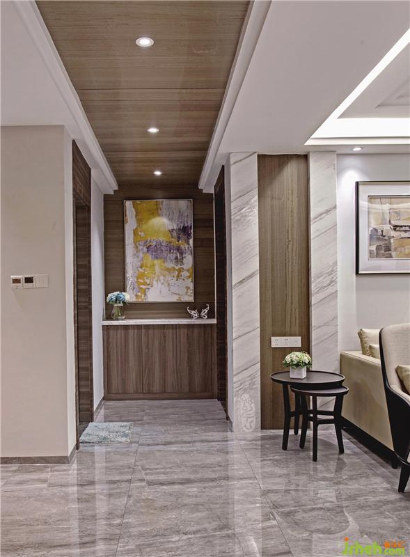 一進(jìn)門,由于頂部木質(zhì)造型延伸性的引導(dǎo),首先引入眼簾的,便是樸素自然的木質(zhì)端景。考慮入戶收納功能,旁側(cè)酒柜與鞋柜的一體化設(shè)計(jì),讓居住者在進(jìn)門處就能提高自己的便利性。