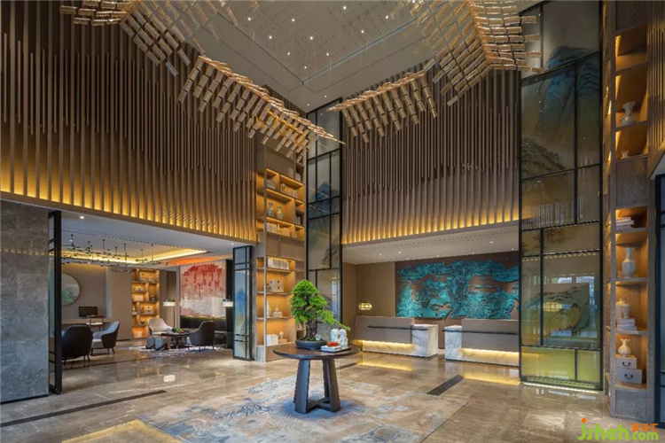 酒店大堂延續(xù)外立面的建筑元素,酒店設(shè)計將四合院的屋頂形態(tài)藝術(shù)化的表達,運用現(xiàn)代的琉璃材質(zhì),塑造現(xiàn)代的時尚與輕奢感。墻面自然元素的屏風與木格柵,營造現(xiàn)代簡潔的和諧之美。