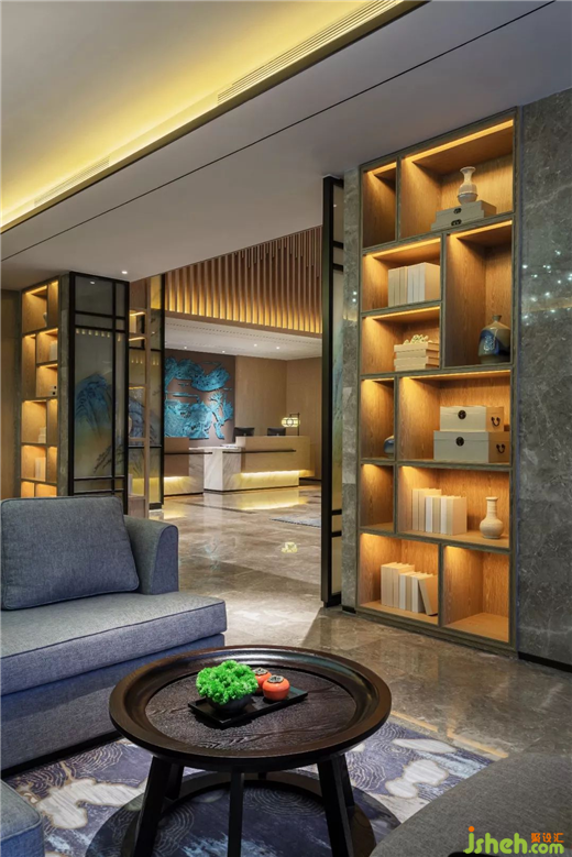 定瓷作為宋代五大名窯之一,酒店設(shè)計師以軟裝陳設(shè)的方式,融入空間柜架中,將傳統(tǒng)建筑、自然、藝術(shù)品相融合,營造出自然、輕雅的城市人文驛站。