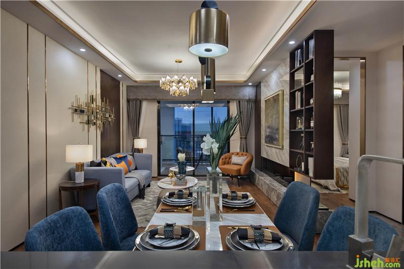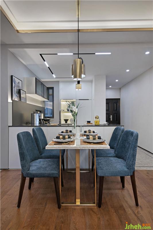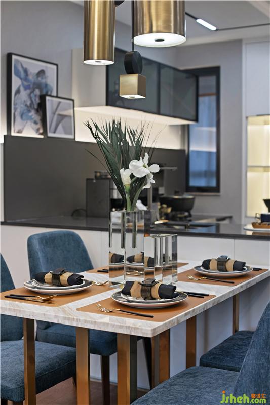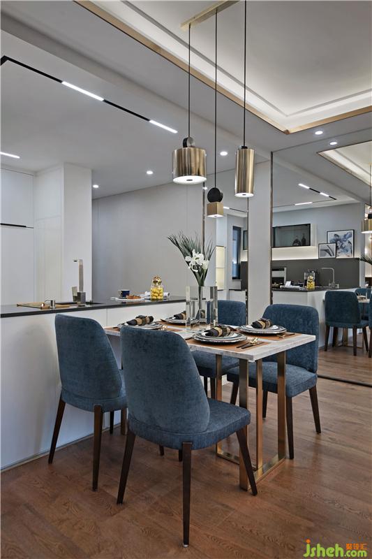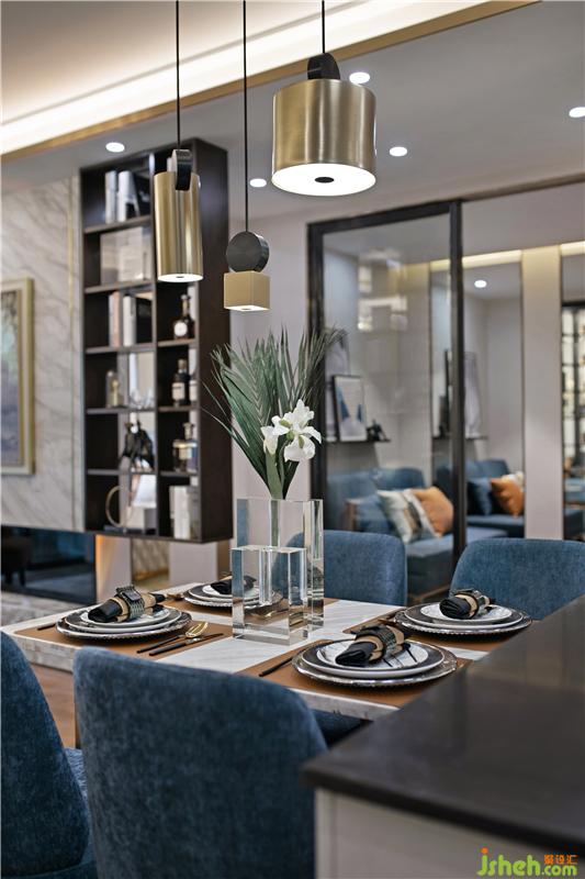 餐廳連著客廳,同時靠近廚房,動線合理,陽臺光線的射入,使整個住所更加通透。樣板房設計