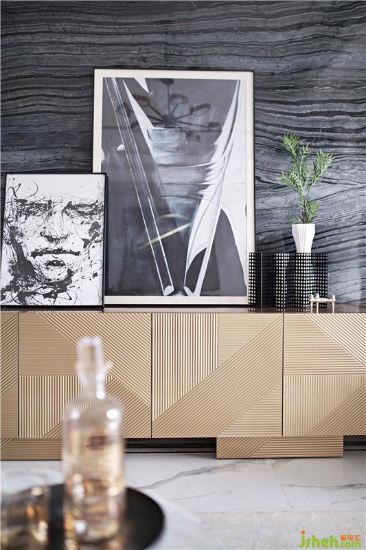 黑色在很多人的印象中是沉悶壓抑的,但是在室內(nèi)設(shè)計(jì)師筆下,這種擔(dān)憂是不存在的。原木色電視柜,精美絕倫的雕刻幾何切面,與古木紋大理石背景墻形成極大的反差感,而使得空間層次更加分明!