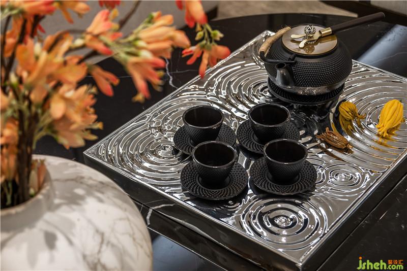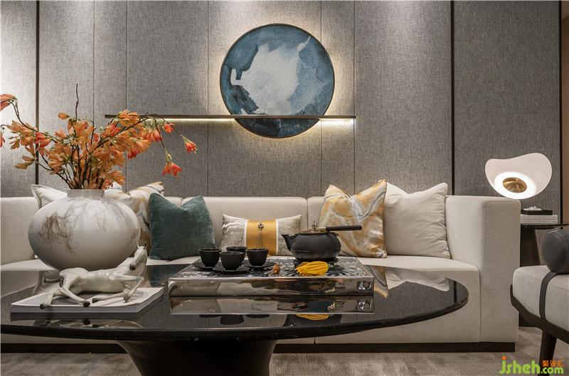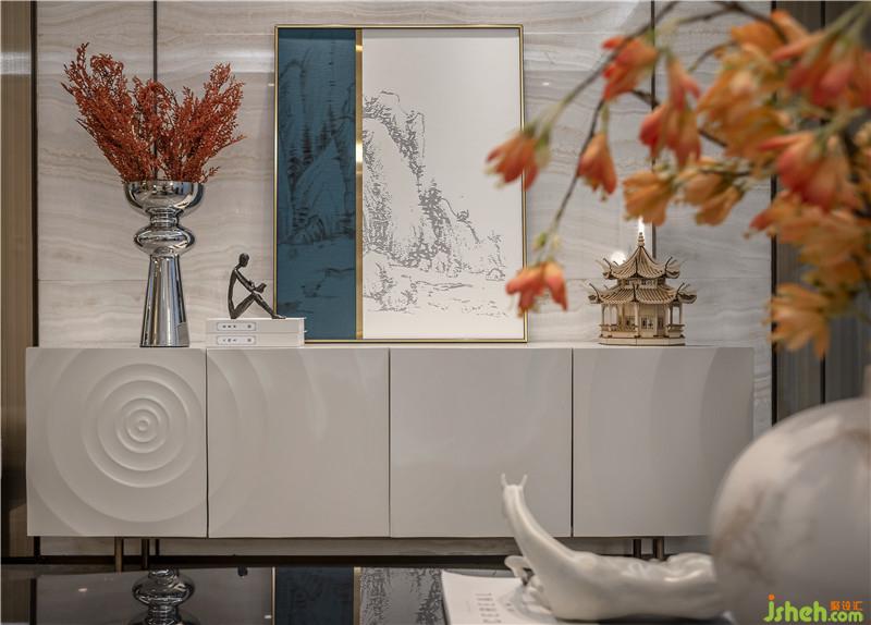 室內(nèi)設(shè)計(jì)師從大自然的感知視角出發(fā),通過攝取大自然山水元素,演繹一個(gè)清靜舒適的禪意居所。樹脂材質(zhì)的掛飾猶如晶瑩剔透的露珠,是整個(gè)空間的點(diǎn)睛之筆。水波紋的電視柜像是水珠滴落在水面上,泛起陣陣漣漪,邊幾為水珠狀的造型,不同造型的角幾,都體現(xiàn)了露珠的不同時(shí)期的形狀,猶如生活,它不會(huì)總是一成不變。
