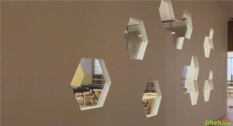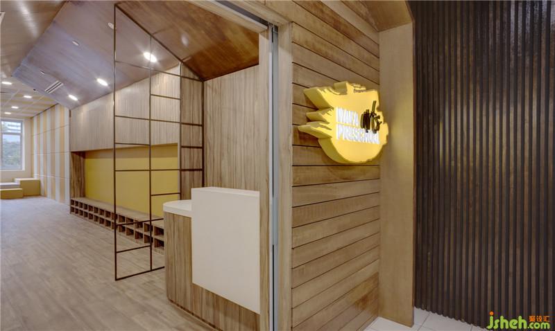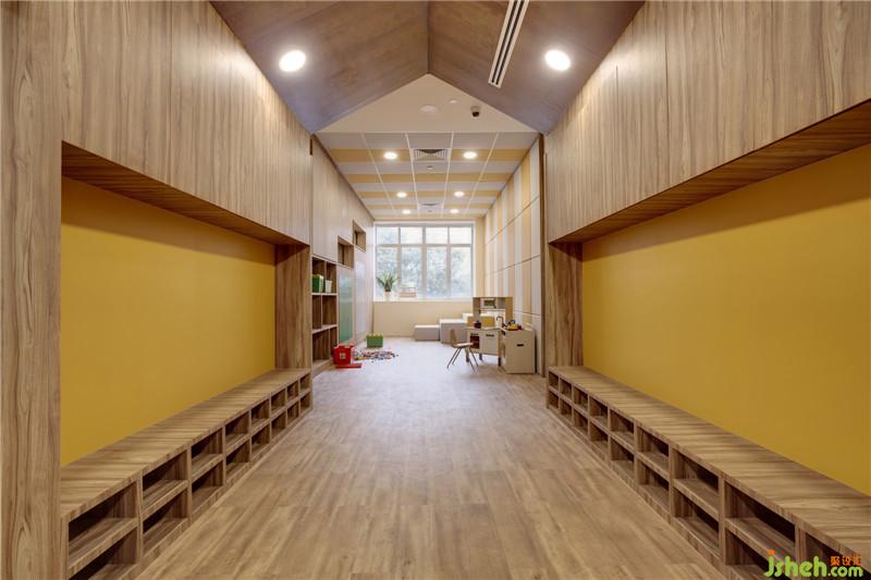 首先,設(shè)計(jì)師使用了簡(jiǎn)單干凈的木色來(lái)作為整個(gè)設(shè)計(jì)的主要顏色,并用木質(zhì)材料取代瓷磚和涂料。孩子們可以赤腳奔跑在木質(zhì)的地板上,在無(wú)形之中向孩子們傳達(dá)低碳,綠色環(huán)保的教育理念。室內(nèi)設(shè)計(jì)師
