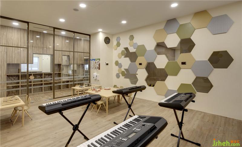 在音樂教室的墻面設(shè)計了三種不同由六邊形由三種顏色的六邊形組成,有青春朝氣的綠色,積極向上的黃色和象征平緩安靜的灰色。運用這三種色彩的淡色系,給孩子們帶來舒緩,放松的效果。室內(nèi)設(shè)計師