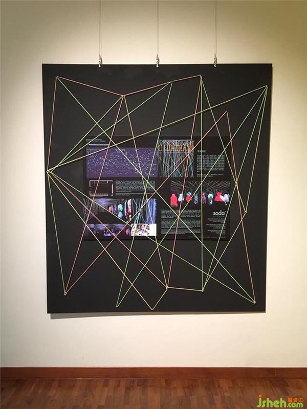 展覽在漆黑空間里用熒光繩相互交織,其實(shí)是將形成星云的超新星爆炸的高速移動軌跡實(shí)體化的一種表現(xiàn)手法。設(shè)計公司
