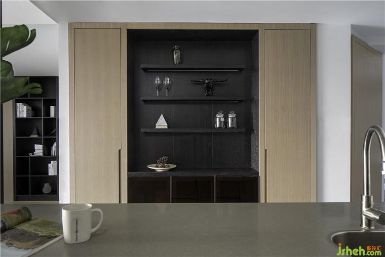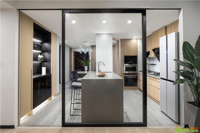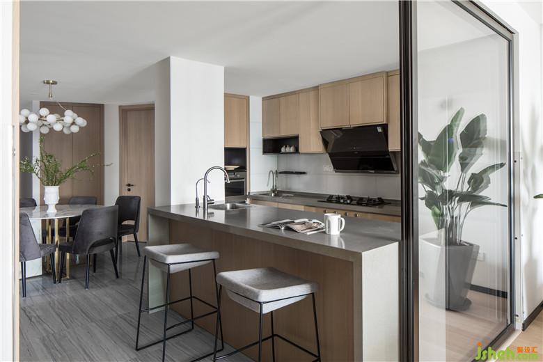 廚房和客廳之間設(shè)計(jì)玻璃大滑門,室內(nèi)設(shè)計(jì)師這樣的設(shè)計(jì)首先可以隔絕廚房的油煙其次讓廚房的區(qū)域光線更加的充足明亮在視覺(jué)上使空間更加的通透。廚房的吧臺(tái)以柱子而建即滿足了業(yè)主對(duì)島臺(tái)的需求同時(shí)也避免了孤立的柱子給空間帶來(lái)的尷尬局面。