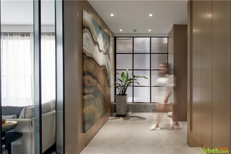 室內(nèi)設(shè)計師將沙發(fā)背后非承重墻打掉,做玻璃隔斷讓空間更有通透性,也增加入戶的視覺進(jìn)深感。