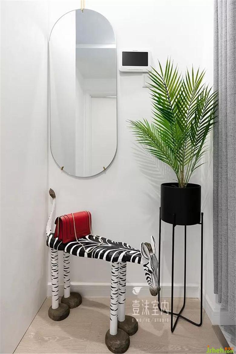 門口的穿衣鏡在網(wǎng)上淘回來的,換鞋凳是一個(gè)斑馬的造型,是一個(gè)民間手工做法打造的。