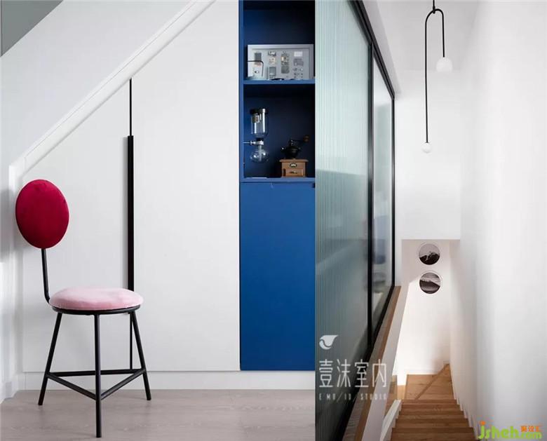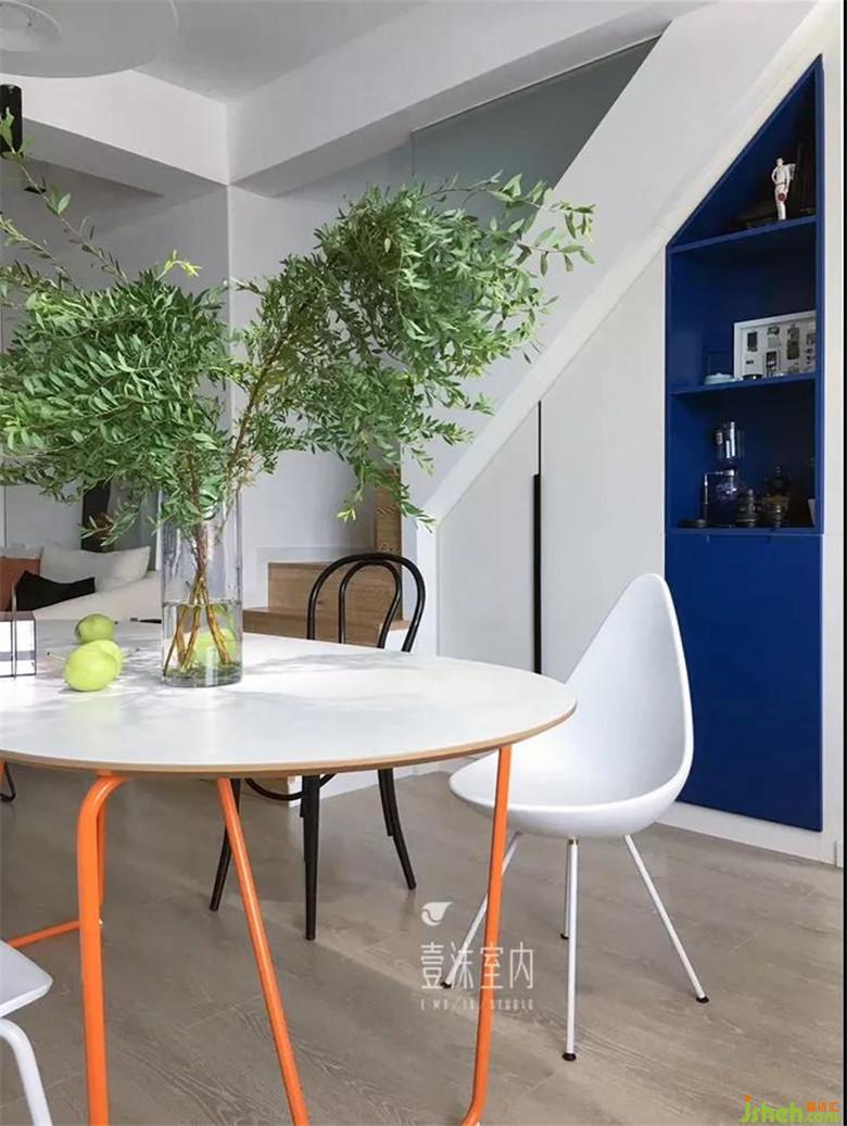 餐廳搭配不同的形狀質(zhì)感的座椅營造一種隨性慵懶的感覺,桔紅色桌腿與藍(lán)色柜面的冷暖對比給人一種強烈的視覺沖擊。
