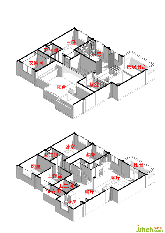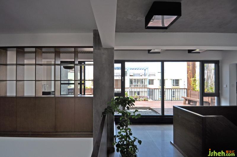 二層:往露臺擴(kuò)建出茶室,在樓梯的一側(cè)加蓋了書房。