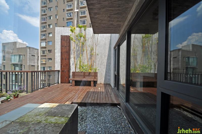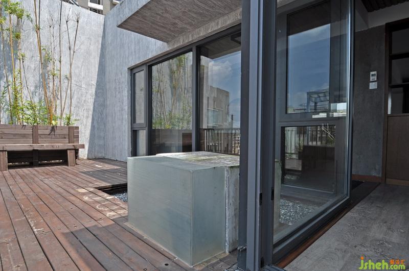 室內(nèi)設(shè)計師在露臺使用防腐木鋪地并預(yù)留空間給屋頂上的水管,兩個舊混凝土水泵則貼合一個新的半透明體塊,內(nèi)含射燈用于晚上露臺的照明。露臺的外墻用簡易的灰色防水涂料粉刷,配上防腐木和室內(nèi)空間相呼應(yīng)。