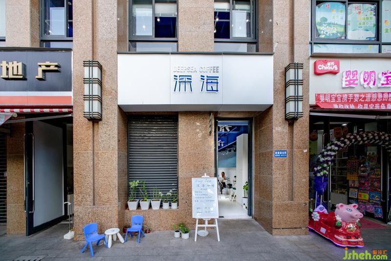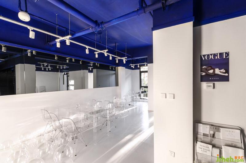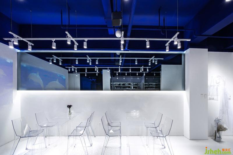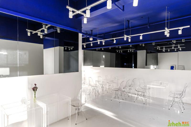 因?yàn)闃I(yè)主確定咖啡館名字叫“深?!?,所以設(shè)計(jì)師花了心思去思考到底“深?!笔鞘裁?。不同于常規(guī)的思考和正常做設(shè)計(jì)時(shí)搜索參考圖片的是,往往這樣的設(shè)計(jì)都是帶有藍(lán)色的空間,但“深?!边@個(gè)名稱所帶來的概念思考卻是,為什么深海是藍(lán)色的?當(dāng)透過這層思考方式去搜索就會(huì)發(fā)現(xiàn),海水之所以是藍(lán)色,是因?yàn)樘炜帐撬{(lán)色的(原理就不多說了),水體(空間)是透明的,所以深海的藍(lán)色是光和材料本身所產(chǎn)生的而非通過“設(shè)計(jì)”創(chuàng)造的。帶著這樣的邏輯,整個(gè)空間的設(shè)計(jì)就很明確了,拆除原有的吊頂,用涂料做成藍(lán)色的“天空”;下面的空間則使用帶有反射性/透明性的材料——鏡面、金屬、亞克力、塑料等,通過這種曖昧的委婉的,而非簡(jiǎn)單粗暴的方式,讓深海的藍(lán)色充滿整個(gè)空間。