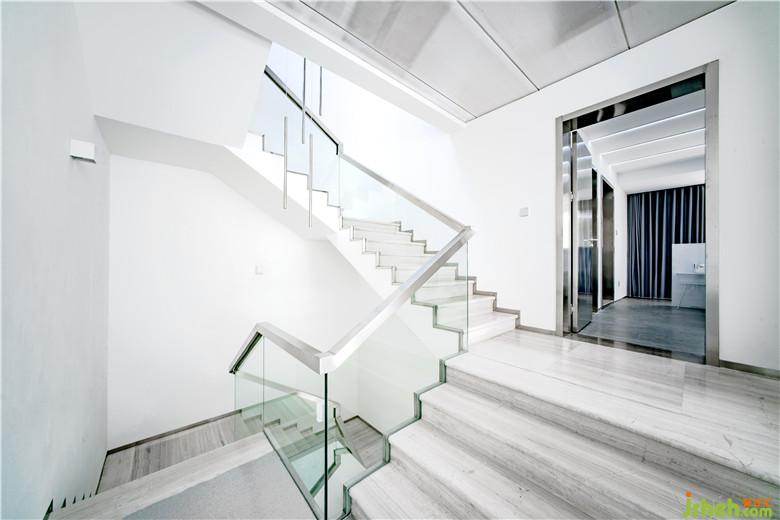 公共空間的設計通過盡可能塑造出的純凈超現(xiàn)實場景來喚醒使用者深藏心底的幻想。公共空間由白色墻面、淺灰色略帶反射的地面,以及幾近朦朧的陽光板營造出純凈、極致氛圍。作為主空間僅有的幾件家具與婚紗,仿佛博物館中的幾件展品,營造一種空靈的效果;墻體內(nèi)的燈光通過陽光板在墻面投射出粼粼波光,這些隱約的光影給主空間的純凈又添加了一絲神秘,去誘發(fā)情侶去體驗其行為活動中細微的變化。樓梯間作為整個建筑中唯一通高的空間,結合線性光的設計元素,我們利用長條筒燈進行再次設計,高高低低地在樓梯間形成一個新的燈光裝置節(jié)點,投下影影綽綽的效果。