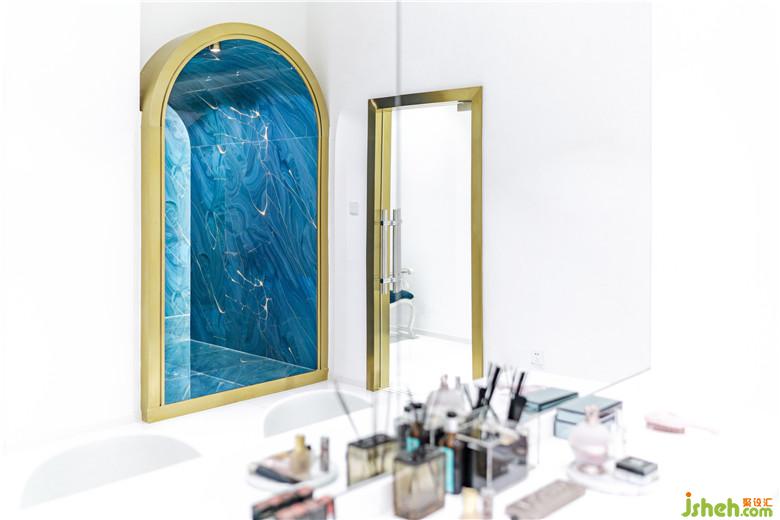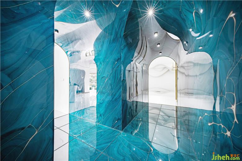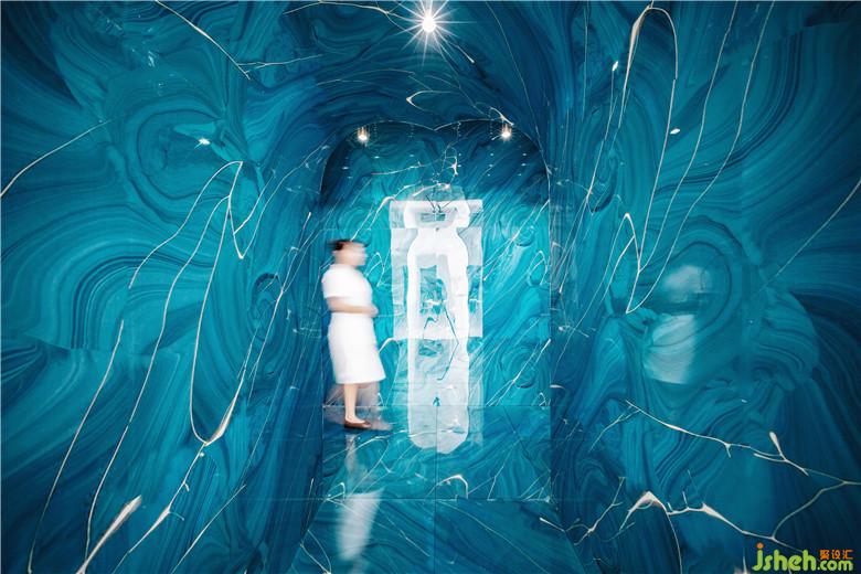 空間選材上,整體運(yùn)用白色木飾面、乳膠漆等作為空間基調(diào),仿古銅拉絲不銹鋼、水晶板、淺灰原木等作為點(diǎn)綴。“T”形通道則采用弧形拱頂,并在墻、頂、地三面上都統(tǒng)一使用藍(lán)色的水晶亞克力板來(lái)打造“深水冰窟”的沉浸式體驗(yàn),使得空間充滿(mǎn)視覺(jué)張力。二者不論在色彩還是形式上都形成鮮明對(duì)比,從而突出強(qiáng)調(diào)了“秘境”通道的獨(dú)特沖擊力。