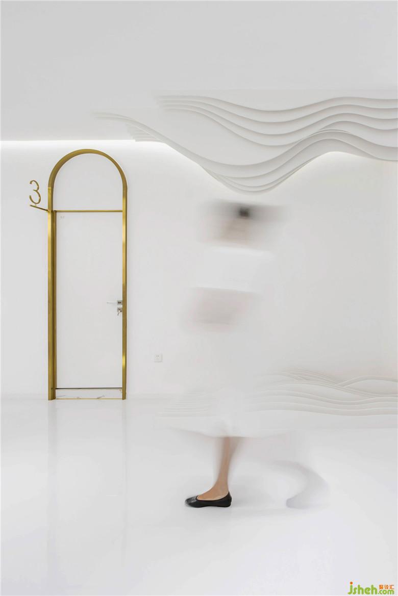 客人由入口至大堂接待區(qū),而后穿過(guò)藍(lán)色的通道開(kāi)啟她們的美麗旅程——依次先穿過(guò)通道在等候區(qū),進(jìn)行膚質(zhì)等等的檢測(cè)和美容問(wèn)題的咨詢(xún),而后穿越一次通道進(jìn)入休閑區(qū),護(hù)膚理療休憩功能一應(yīng)俱全,客人能在這里舒適地享受護(hù)理服務(wù)、交談、茶座等,寬敞的休閑區(qū)還未沙龍、講座的公共行為提供了可能性。三處空間私密性遞增,通道則是不同功能與空間畫(huà)面間的轉(zhuǎn)場(chǎng)。