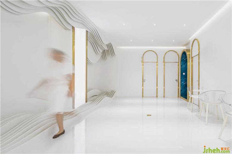 作為“秘境”的延伸,加強對山水之境的渲染,室內設計師在休閑區(qū)采用了大量的波浪形雕塑,它們有的從天花板上垂掛而下,有的矗立在地面上,層層疊疊,而每一層的線形又富于柔和的起伏變化,極具層次感。它們是山的意象又是水的幻化。