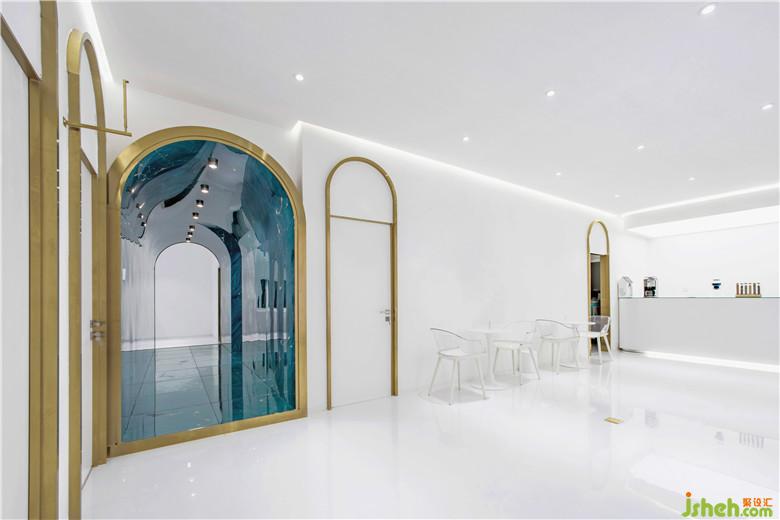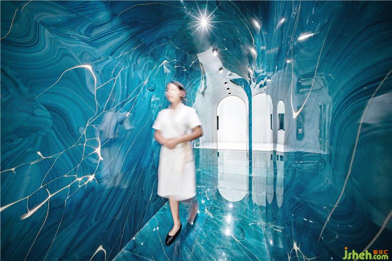 行至此間,恍如身處深水密穴,很好地豐富了客人的空間體驗感。它巧妙地減少了交通空間的占用面積,從而能留出更多的空間給公共活動,以提升空間使用的舒適度,盡管在色彩與材質上過道空間與其他空間形成了鮮明對比,但通過波浪形的雕塑對這種山水氛圍的渲染,使整個空間成為一個整體。