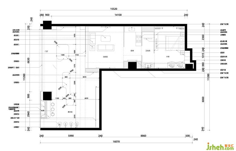 由于空間面積有限且平面本身形狀較為特殊,依照傳統(tǒng)家居體驗(yàn)館模擬真實(shí)家居環(huán)境的模式極易造成功能分布混亂且尺度失調(diào)。其次,考慮到體驗(yàn)者各自的家庭內(nèi)飾風(fēng)格、個(gè)性、審美特質(zhì)等等均存在差異性,嘗試模擬真實(shí)環(huán)境的設(shè)計(jì)反而容易適得其反,產(chǎn)生陌生疏離感。因此,布局上將單個(gè)家居場(chǎng)景與線性的體驗(yàn)流線相結(jié)合,按照私密性由弱到強(qiáng)的順序,依次從外而內(nèi)布置客廳、廚房、洗手間、臥室,使顧客得以在場(chǎng)景模塊間“穿梭”,不同場(chǎng)景中的各個(gè)產(chǎn)品的特性、優(yōu)勢(shì)及使用方法也隨之得到理性且明確的傳達(dá)。