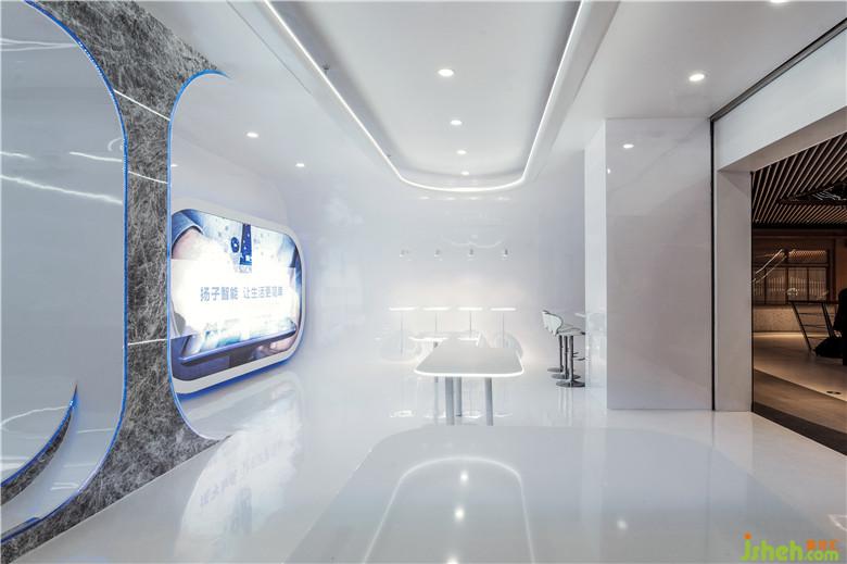 從模塊空間的界面形狀到展臺(tái)的邊緣、信息墻的形狀、燈具的造型,整體均貫徹處理成為弧線,柔化科技的距離感和冰冷感,裝修公司使智能家居的呈現(xiàn)更加親切自然。為強(qiáng)調(diào)曲線造型,在邊緣交界處的墻面使用大理石貼面,石紋質(zhì)感強(qiáng)調(diào)家居屬性,為空間添加了重色,豐富了層次感,也使純白色的空間環(huán)境不至于過(guò)度冷漠。
