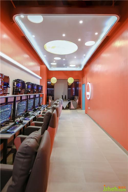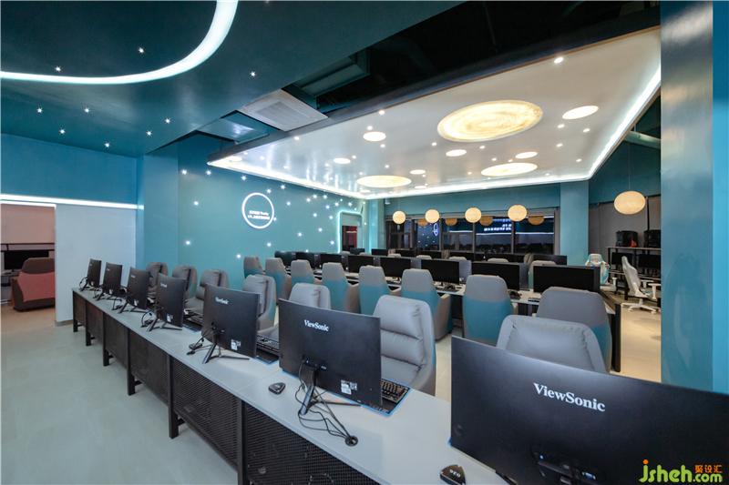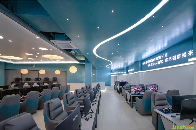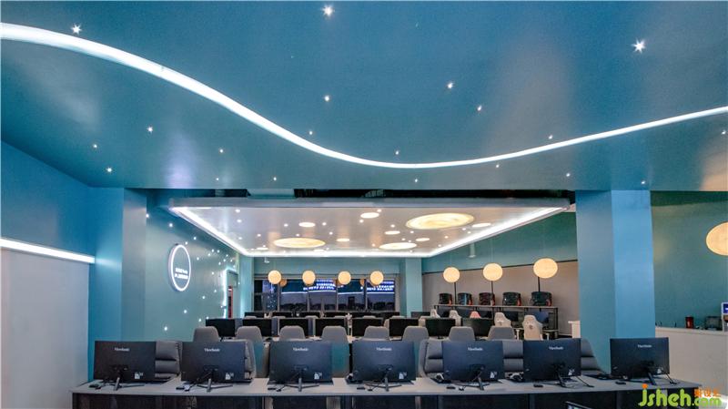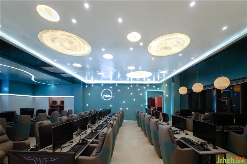 為了更好地突出網(wǎng)咖的主題概念,將吊頂作為設(shè)計(jì)的重點(diǎn)部分。吊頂采用石膏板,并結(jié)合燈珠和LED燈帶等不同燈具點(diǎn)晴視覺效果,成功統(tǒng)一了空間內(nèi)元素,奠定了室內(nèi)的整體基調(diào)。墻板藍(lán)色的底色,結(jié)合彎曲延伸的燈帶和星羅棋布的燈珠營(yíng)造出銀河太空般夢(mèng)幻的氛圍。光成為一種全新的設(shè)計(jì)語言,大大小小的圓形光源宛若小小星辰,不僅在功能上聚焦人們的視線,也體現(xiàn)出空間的明暗層次,更好的豐富了玩家的休閑娛樂體驗(yàn)。燈光在材質(zhì)表面暈展,材質(zhì)對(duì)光也有良好的映射效果,在這里,燈光似乎改變了空間,游戲玩家在虛擬世界中探索遨游,釋放自己,追逐著內(nèi)心的星辰。會(huì)所設(shè)計(jì)