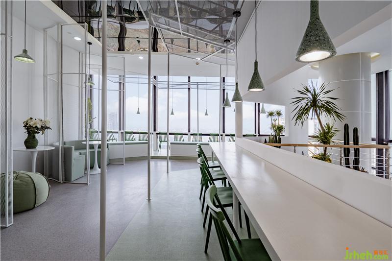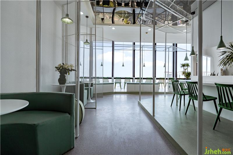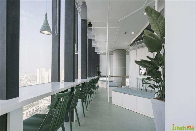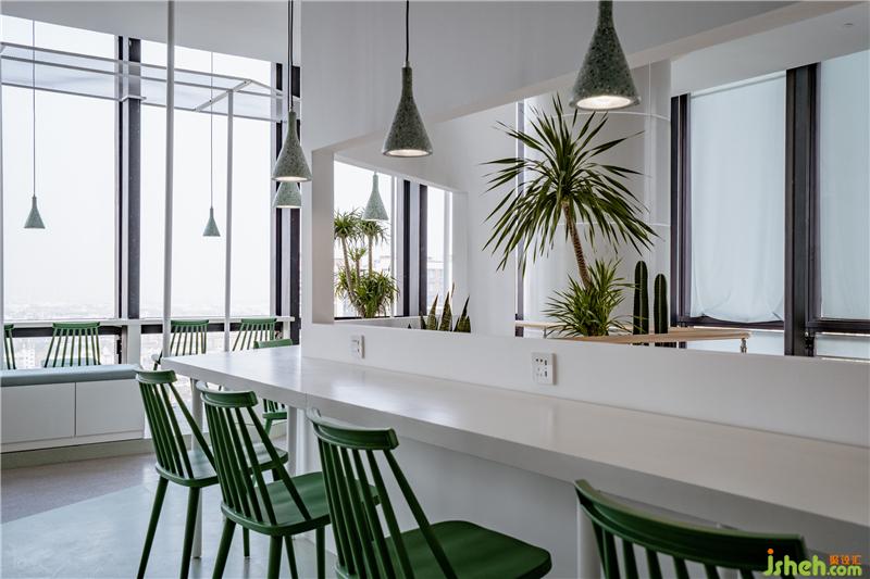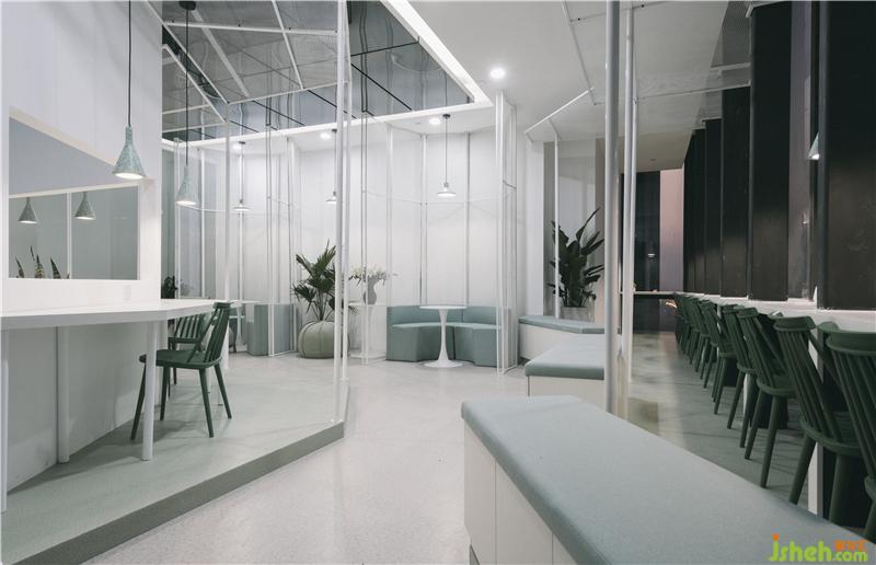 在這里,人們可以短暫逃離繁忙都市的現(xiàn)實,猶如置身于寧靜的自然花園,在緊張的工作中使身心得到放松,從而提高學習效率。精巧構(gòu)思的曲線性的工作臺與直線性的走廊空間形成對比,連續(xù)的曲線界面將辦內(nèi)部空間分割成不同的區(qū)域,使人產(chǎn)生不同的過渡體驗;鋪設(shè)在桌椅下的綠色鋪裝好似置身草地氛圍;穿插于工作臺之間的相對低矮的蕨類等小型植物既能讓客戶感知自然,功能上又可切實地改善室內(nèi)微氣候與環(huán)境,自習室裝修設(shè)計使每一個角落都能被綠色充滿;半通透式白色沖孔板圍而不合,模糊了空間的邊界,于是墻體的堅實感被消解,改變空間分割呆板的印象。純粹、自然、輕盈是整個空間遵循的主題,在喧鬧的姑蘇街景映襯下,它仿佛是靜止的,成為都市中一道亮麗的風景線。借窗外市井的生活,不同場景的引入讓每一個自習角落都不盡相同,或綠或白讓每一個客戶都有一個專屬于他自身的棲身之所。