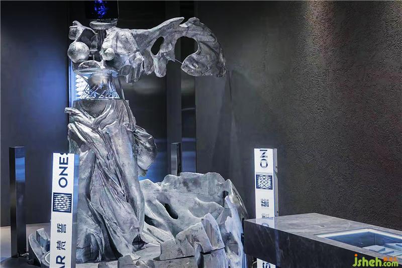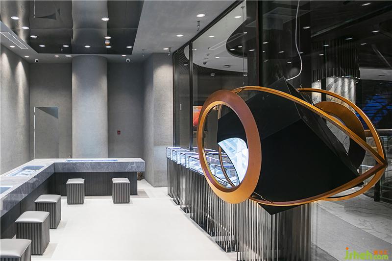 墻面和銷售展柜桌面都采用深灰色石材飾面,展示柜采用定制金屬,營造粗粒又不失精致感的空間調(diào)性,與產(chǎn)品相呼應(yīng)。