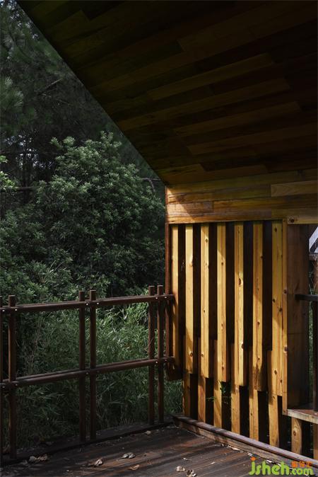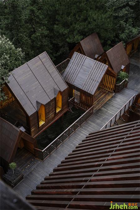 九江民宿設(shè)計(jì)也得益于這樣的天然稟賦和設(shè)計(jì)方法,最終呈現(xiàn)的建筑反而充滿呼吸感:3種類型的小木屋模塊嵌入到場(chǎng)地中,平臺(tái)為適應(yīng)地形而呈現(xiàn)出高低錯(cuò)落的節(jié)奏。我們決定了木屋的朝向與開口方式,使他們成為互相之間的取景框。小木屋主材采用防蟲防腐處理后的洪雪松木,還暴露著原始的木制紋理。我們甚至不希望這里看起來像一座干凈整潔的新建筑,而應(yīng)該是材料與環(huán)境間已經(jīng)持續(xù)數(shù)載的一場(chǎng)親密對(duì)話。