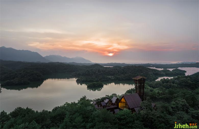 The steel structure observation tower is the highest point of the entire island, visitors can have a good view for the whole lake area when standing on the top. The fa?ade of anticorrosive wood grille designed to reduce wind resistance presents various permeability from different viewing angles: when people looking from the boats on the lake, the towers erected in the jungleis looming. At sunrise and sunset, sunlight seeps from the gaps in the grille.
