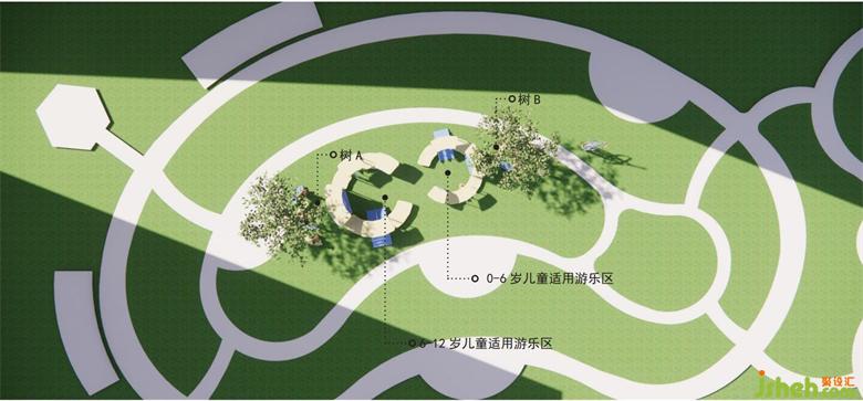 According to the field investigation, the space in the middle of the original fitness park was selected as the children's amusement park and the other places retained their original functions. As shown in the master plan, the distance from tree A to tree B was measured in the field at 13.5 meters. There are two opposite circles between the trees. One side serves as arecreation area for children aged 0-6 years and the other side serves as arecreation area for children aged 6-12 years. At the same time, there are two gazebo rest areas centered around the trees. The design of the park is based on the principle of dynamic and static combination, and each circular area gives consideration to the functions of recreation and rest. At the same time, the design contrasts with the preserved natural landscape and becomes a distinct feature to describe the friendly community interface. The design leaves enough space in accordance with the volumetric relationship between children and parents, so that both groups can interact in the space even though the scales of adults and children are staggered.