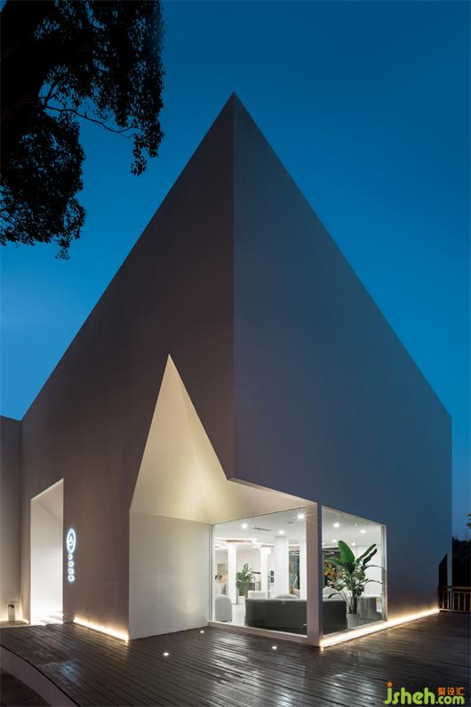 為了與原有建筑的坡屋頂形式有所呼應(yīng),并延續(xù)品牌一貫的坡頂白墻的設(shè)計(jì)元素。設(shè)計(jì)師用純凈的白色方盒子外殼將原有的建筑包裹在內(nèi)部,立面以坡屋頂形式的窗洞向內(nèi)延伸,將原有建筑與外部方盒子相連接。