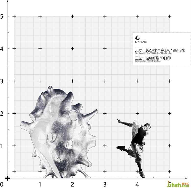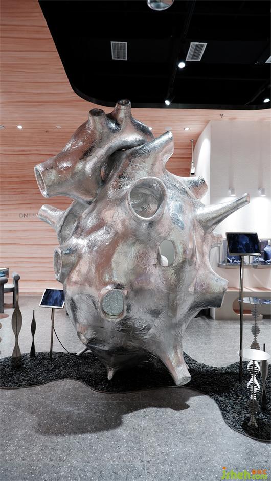 裝置整體采用玻璃纖維3D打印工藝,使用鋁箔紙?jiān)诒砻孀龀鲴薨櫟募±恚仁菍?duì)心臟纖維的意象表達(dá),也營(yíng)造出時(shí)尚先鋒的金屬質(zhì)感,打造藝術(shù)外形的同時(shí)又體現(xiàn)著理性與克制的美感。