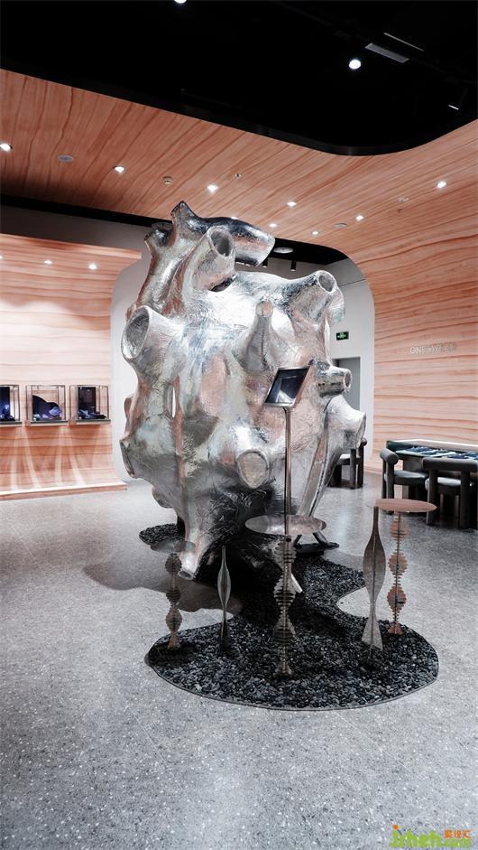 裝置以跳動(dòng)的心臟為主題,位于門店中央最顯眼的位置,聚集燈光和視線,強(qiáng)烈的存在感提醒著人們審視自己的重要性。珠寶店設(shè)計(jì)師并沒有刻意模仿真實(shí)的心臟造型,而是將其進(jìn)行藝術(shù)化處理,將極小曲面理論運(yùn)用到裝置上。