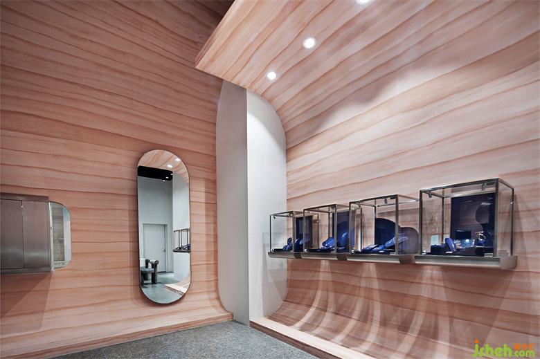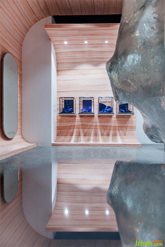 In the design, the advantages of the original regular site are used to create a complete and unified free experience space. The wallwith rammed earth paint is like a flowing ribbon surrounding the whole space. The wall that should be vertically intersected is chamfered. The soft and flowingshape of the curve itself gives people a soft and dynamic feeling. The stainless steel side of the wall reflects the exquisite sense of the jewelry shop and the pursuit of detail quality.