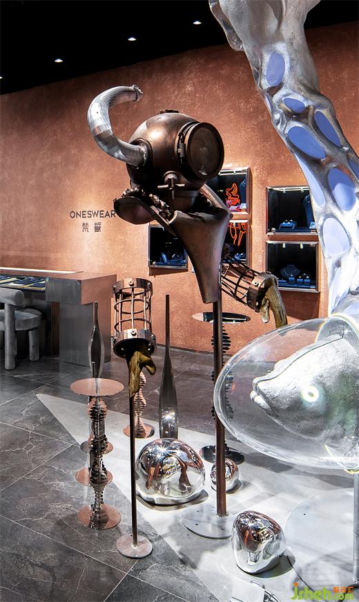 主體的造型通過3D打印實現(xiàn),對質感的刻畫則使用金屬漆和涂料手動完成。長沙珠寶店設計裝置周圍散落著一些不銹鋼制作的裝飾,模擬海底環(huán)境。
