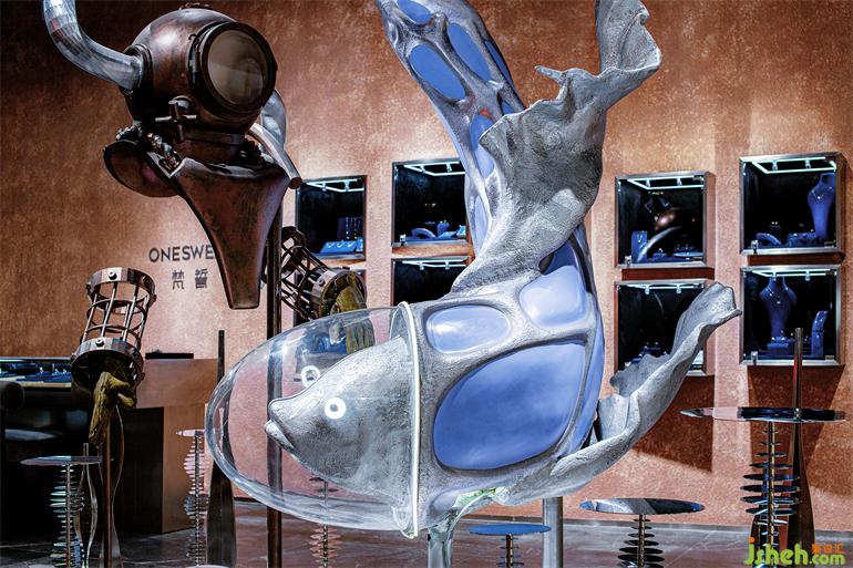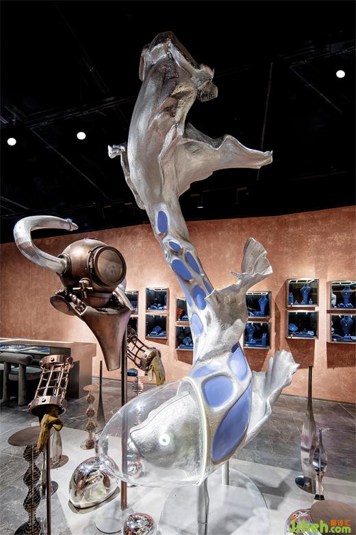 長沙珠寶店設計位于門店主入口中央最顯眼處的藝術裝置以組合的形式呈現(xiàn),兩個主體作為邂逅的主角各自呈現(xiàn)特質又和諧共存于深海世界。