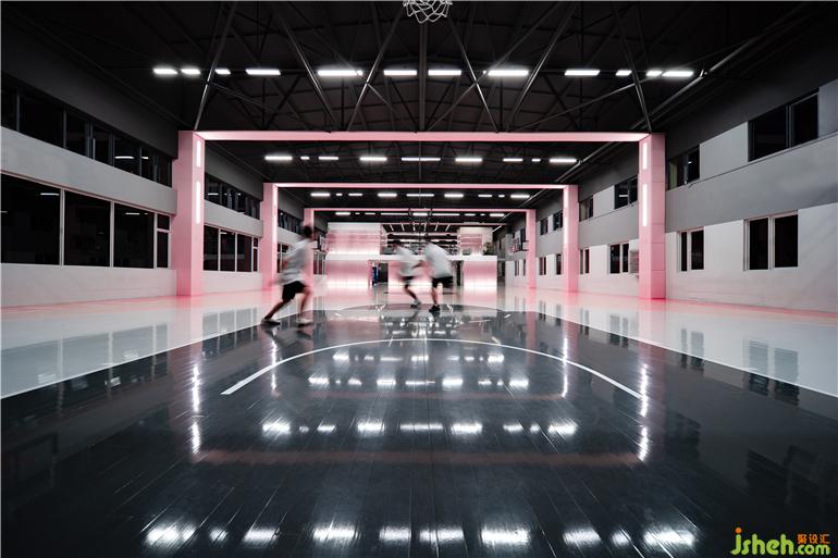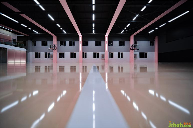 ▼室內(nèi)采用黑色與粉色,配合橡木質(zhì)地板等,創(chuàng)造一個(gè)有層次的空間,basketball court, using the neutral color tones, oak floor system to create an interior space with simple and elegant spatial layers © Yixiang Wang