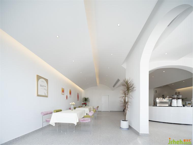 得益于將原窗戶和門都拆除使得舊建筑和新加建的部分更加連貫使用面積也擴(kuò)大了許多,我們將吧臺(tái)依附于新舊交接的墻體置入空間當(dāng)中,這樣整個(gè)大廳就能以咖啡吧臺(tái)為核心連接和輻射整個(gè)空間,較長(zhǎng)的吧臺(tái)在空間交接的地方用圓弧的方式來(lái)引導(dǎo)人們過(guò)渡到空間的另一端,右側(cè)新建的副樓則用做店主平時(shí)接待一些私人朋友的區(qū)域,空間整體以干凈整潔的白色調(diào)為主,家具上點(diǎn)綴些許色彩,室內(nèi)吊頂和樓梯都用了層疊弧形作為基礎(chǔ)語(yǔ)言的構(gòu)件包裹空間,亦如湖水推到岸邊濺起水花時(shí)的回流碰撞。