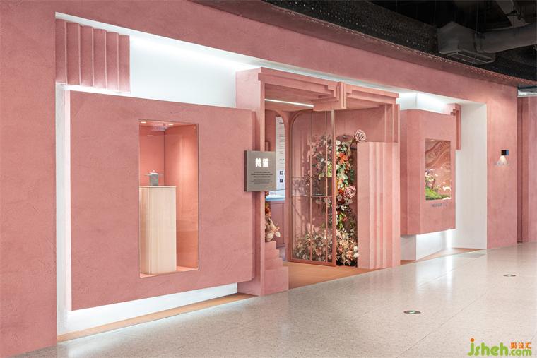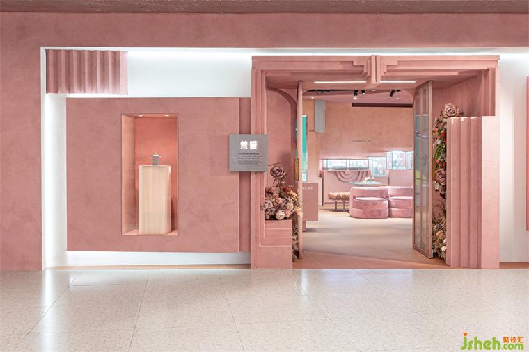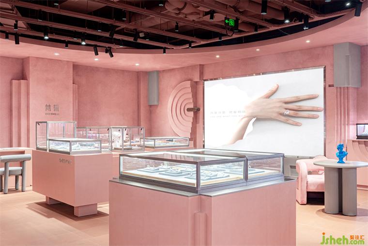 The design abandons the formulaic design ways of traditional jewelry stores, it does not pursue gorgeous decoration such as precious stones, wood grains, and metal edges in, but uses mottled light pink texture paint to find an emotional balance between simplicity, roughness, and gentleness.
