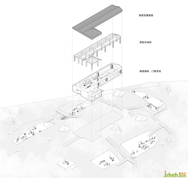茶室設(shè)計(jì)既有建筑是由一個(gè)木構(gòu)架的廊道和亭子組成的休憩配套建筑,且兩個(gè)構(gòu)筑不是同一時(shí)間建造的。場(chǎng)地面朝四明湖,背靠環(huán)山竹林,東側(cè)和北側(cè)的竹林給人很強(qiáng)的包裹感。在這樣自然資源極為豐富的空間,我們和業(yè)主都認(rèn)為該項(xiàng)目應(yīng)建立與自然長(zhǎng)期的鏈接,重新喚醒使用者對(duì)于自然的感知?;趯?duì)現(xiàn)場(chǎng)的空間感知,我們提出了兩個(gè)重要的設(shè)計(jì)要點(diǎn)作為設(shè)計(jì)的切入點(diǎn):微介入和觀景。