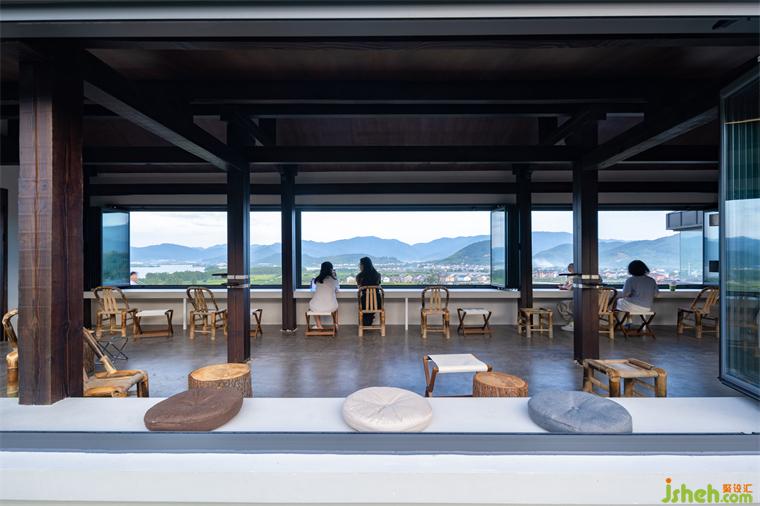 茶室中最引人注目的特點(diǎn)之一,便是朝向四明湖的一整片長(zhǎng)條形折疊窗,占據(jù)了整整一面墻壁,猶如一個(gè)獨(dú)特的取景框。茶室設(shè)計(jì)在宜人的天氣里,這橫向折疊窗可以完全敞開,讓客人盡情欣賞美不勝收的景色,隨時(shí)享受微風(fēng)拂面的宜人感覺。