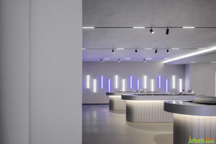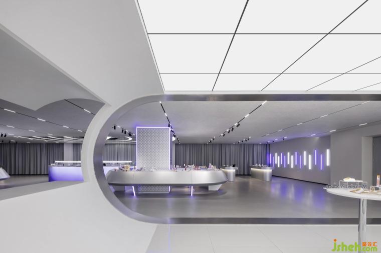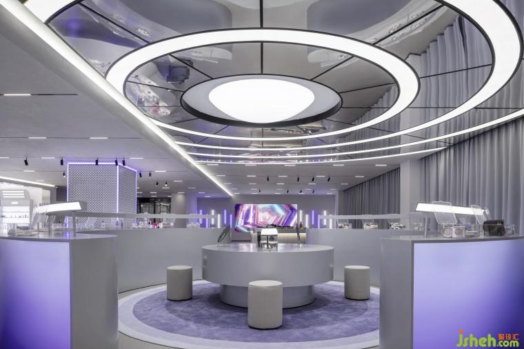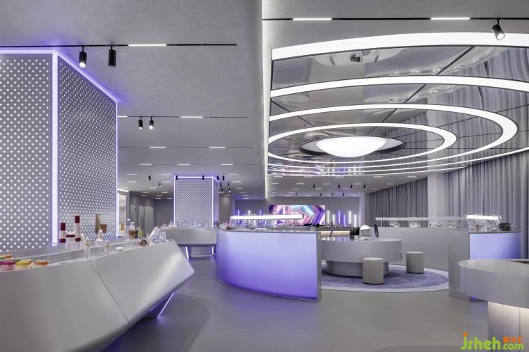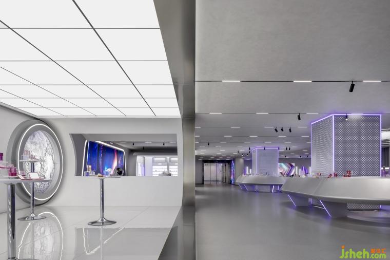 在燈光營(yíng)造方面,巨大顯示屏展示廣袤宇宙,配合白紫相間的線性燈帶,像跳動(dòng)的星系,瞬間將人帶入未來(lái)時(shí)空;“太空艙體驗(yàn)區(qū)” 的環(huán)形燈帶搭配銀灰色金屬材料,LED燈如璀璨星河,增添夢(mèng)幻感??臻g構(gòu)建上,化妝實(shí)驗(yàn)艙的弧形設(shè)計(jì)搭配網(wǎng)格拉膜天花,模擬太空艙環(huán)境;實(shí)驗(yàn)艙的觀察窗,透出的真實(shí)世界與宇宙奇觀形成對(duì)比,增加空間層次,以往商品陳列區(qū)的傳送帶元素模擬物資運(yùn)輸,兼具功能與科技感。