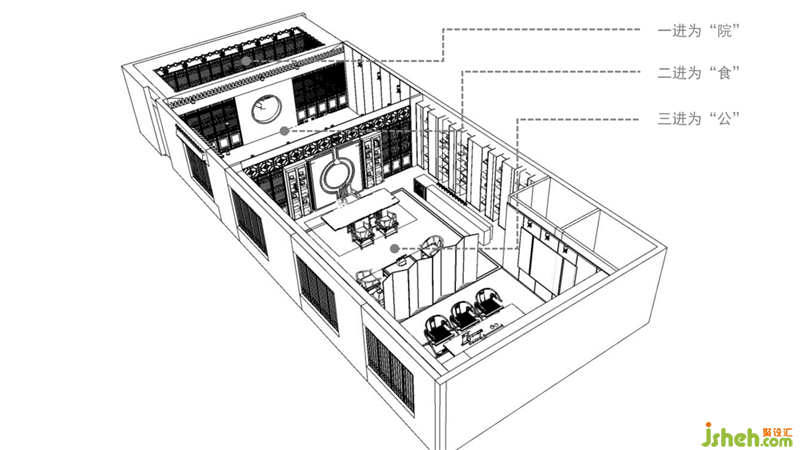 那么這個項目里,我們在一個室內(nèi)空間中營造了一個“狹義”的三進(jìn)四合,一進(jìn)為“院”,二進(jìn)為“食”,三進(jìn)為“公”。