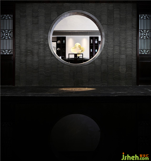 在第一進(jìn)室內(nèi)空間,營造模擬的天井院落,綠植,流水,假窗等,遵循中國式的浪漫主義,即“誰道江南風(fēng)景佳,移天縮地入君懷”,由“園”到“室”,這是中國人對于“天人合一”的一種追求。頂部發(fā)光的燈膜吊頂及墻面發(fā)光的玻璃窗,似乎這即是天光。