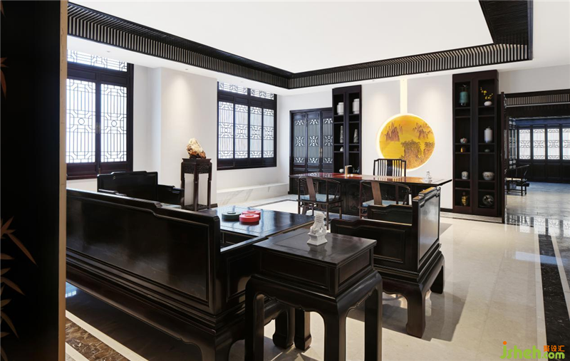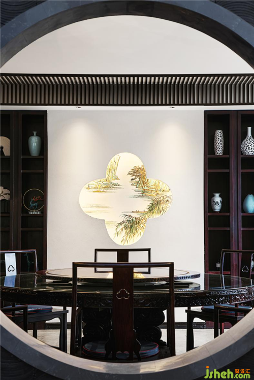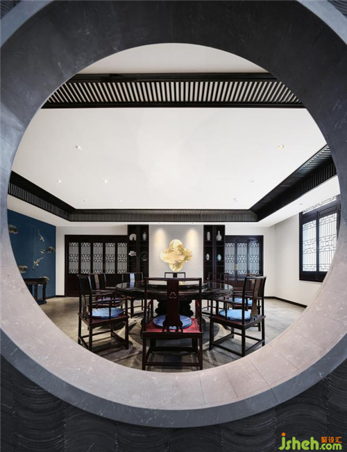 二進(jìn)營造吃飯喝茶的餐食區(qū)域,設(shè)計了圓桌,這是傳統(tǒng)中國人就餐的方式,配備暗門的廚房。南京會所設(shè)計上與第一進(jìn)和第三進(jìn)相連,所有圍合的花格門皆可打開,閉而不合,不豎實墻。