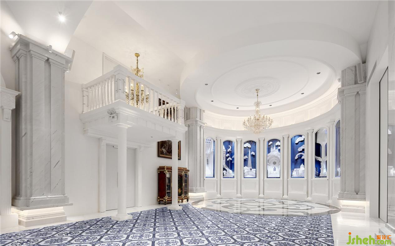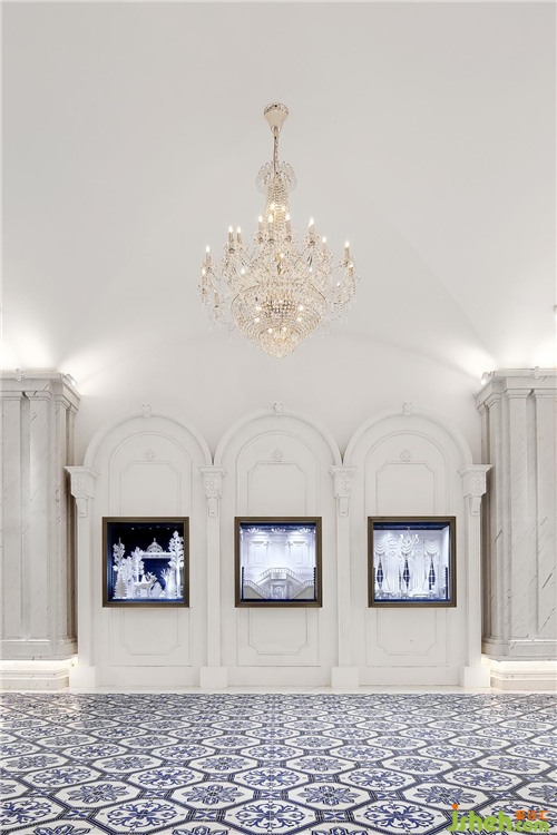 青花瓷與歐洲是有著悠久的歷史淵源的,作為元代橫空出世的曠世瓷器,本身它就是一件完美的中西方融合的產(chǎn)物,元人西征,南京展廳設(shè)計(jì)用中國瓷器的制造工藝,及中歐特有的蘇麻尼青料,創(chuàng)造了青花瓷特有的藍(lán)色,所以自此青花在而后的明清時(shí)期不僅成為歷代達(dá)官貴族追捧的收藏件,同時(shí)又通過古絲綢之路成為了歐洲的寵兒,在歐洲古典繪畫中常會出現(xiàn)青花瓷的身影,所以色調(diào)上整個(gè)藝術(shù)廊把青花的蘇麻離青料特有的青灰色地磚作為地面,而這也成為了空間中唯一硬裝基礎(chǔ)上可見的顏色。